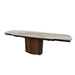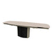 La mesa Yoroi está inspirada en la antigua armadura de los samuráis, a base, con ranuras verticales e inserciones de madera, tiene una fuerte presencia, contrastando el