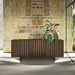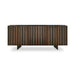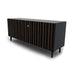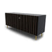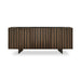La puerta Stripes presenta un motivo de bandas verticales irregulares. El acabado en bronce cepillado crea un juego de volúmenes y profundidad que define la estética del aparador, convirtiéndolo en un punto focal del salón.
