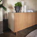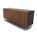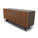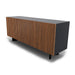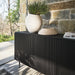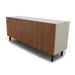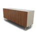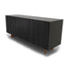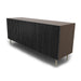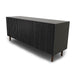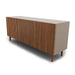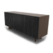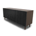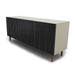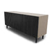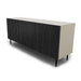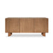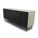 En la puerta Vertical, el motivo canelado se reinterpreta en dos variantes de acabado. El vidrio, clásico y elegante, reinventa la vitrina tradicional con un toque contemporáneo. La madera, cálida y sofisticada, eleva el material, aportando al salón una nueva dimensión táctil.