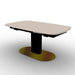 es una mesa extensible de líneas ovaladas bien definidas que le confieren una fuerte personalidad y permiten estabilidad y máxima utilidad del espacio bajo la tapa. La columna central, de metal pintado, sostiene los diversos tipos de tapas de una refinada combinación de metal/madera o una moderna de metal/cerámica con efecto de mármol que juegan con la unión de materiales fríos y cálidos.