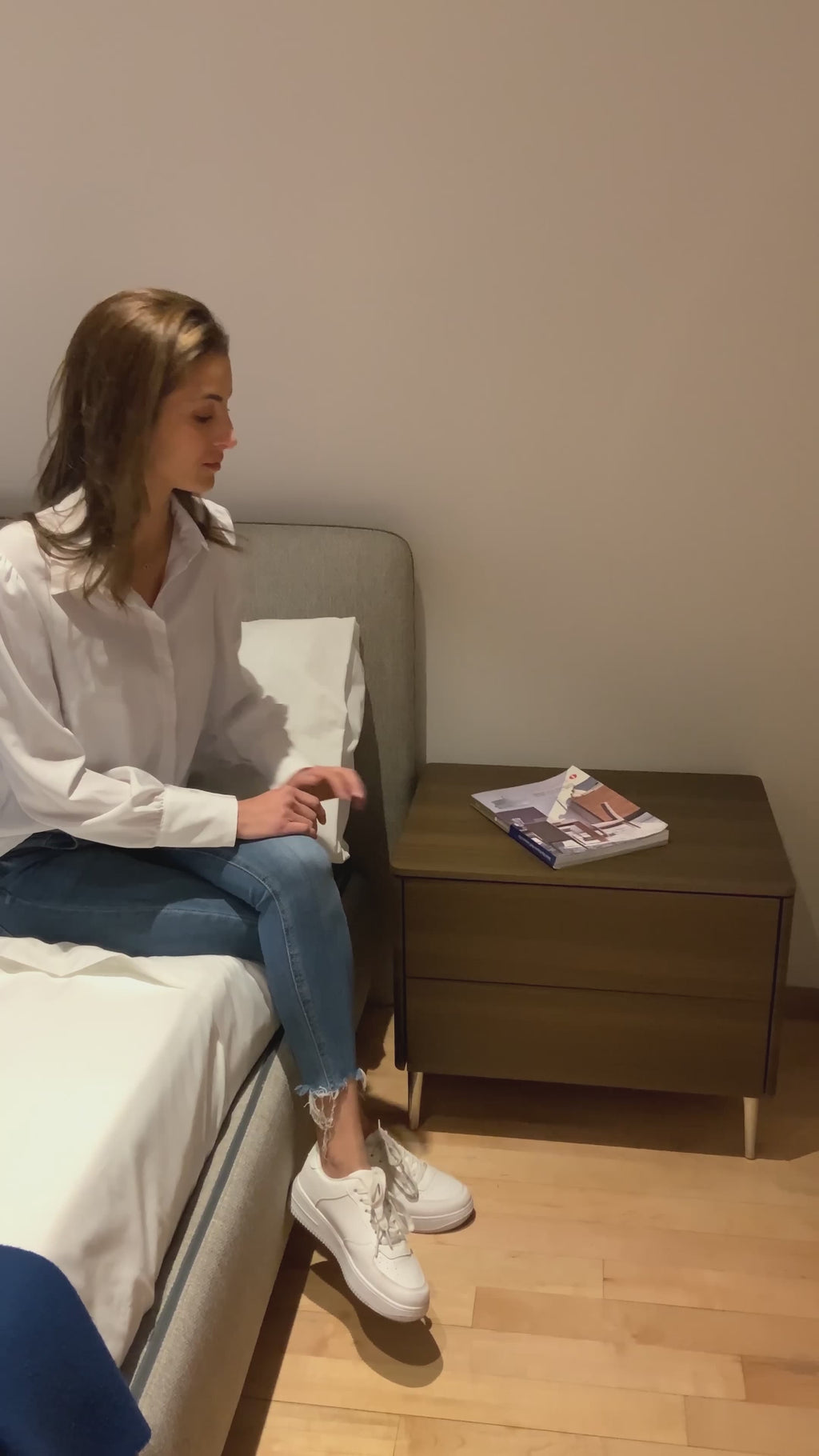 BOSTON es una mesita de noche con un diseño lineal y moderno. Los cajones sin tiradores se abren con el sistema de empuje (push-pull) y presentan un mecanismo de cierre amortiguado.